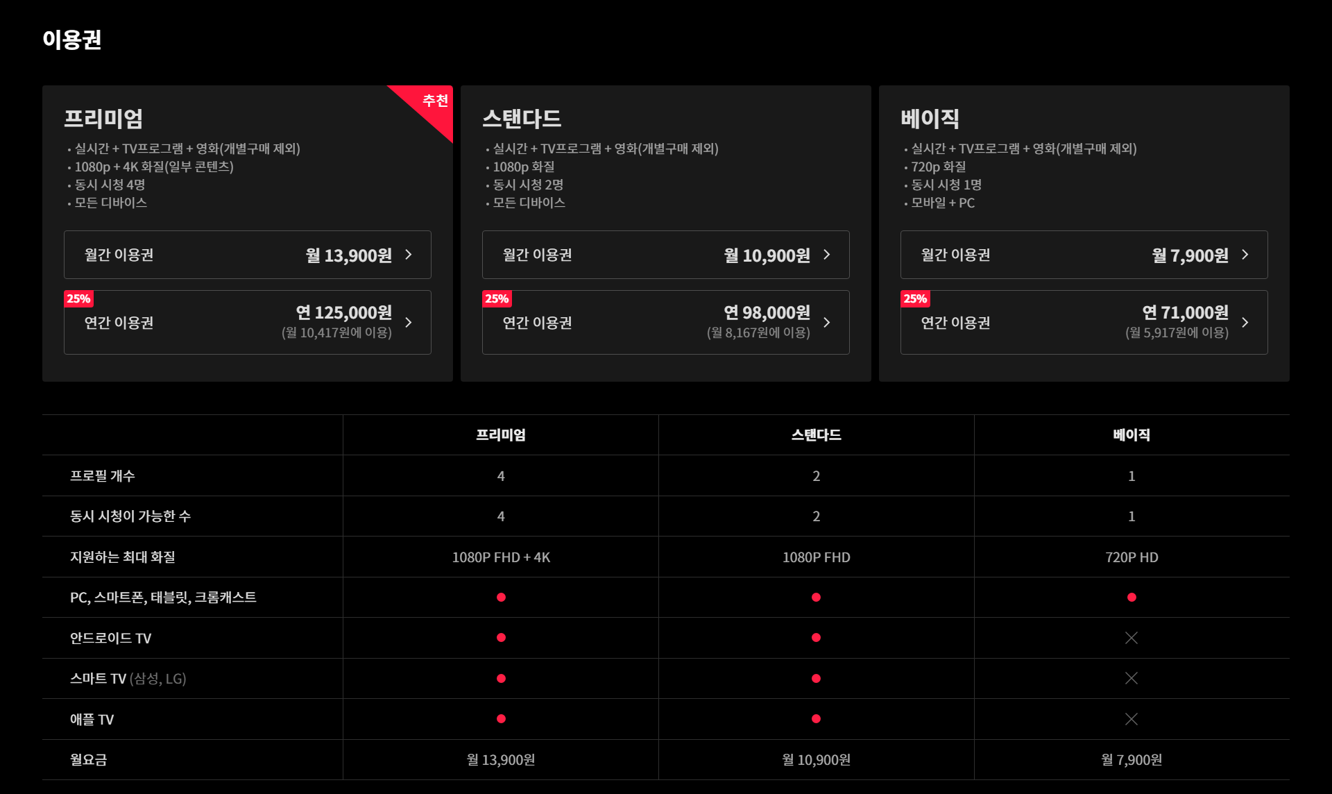 티빙 이용권 종류는 베이직, 스탠다드, 프리미엄 이렇게 총 3가지로 구성되어 있습니다. 자주 보는 콘텐츠나 가족 구성원에 맞게 골라서 이용하시면 될 것 같습니다.